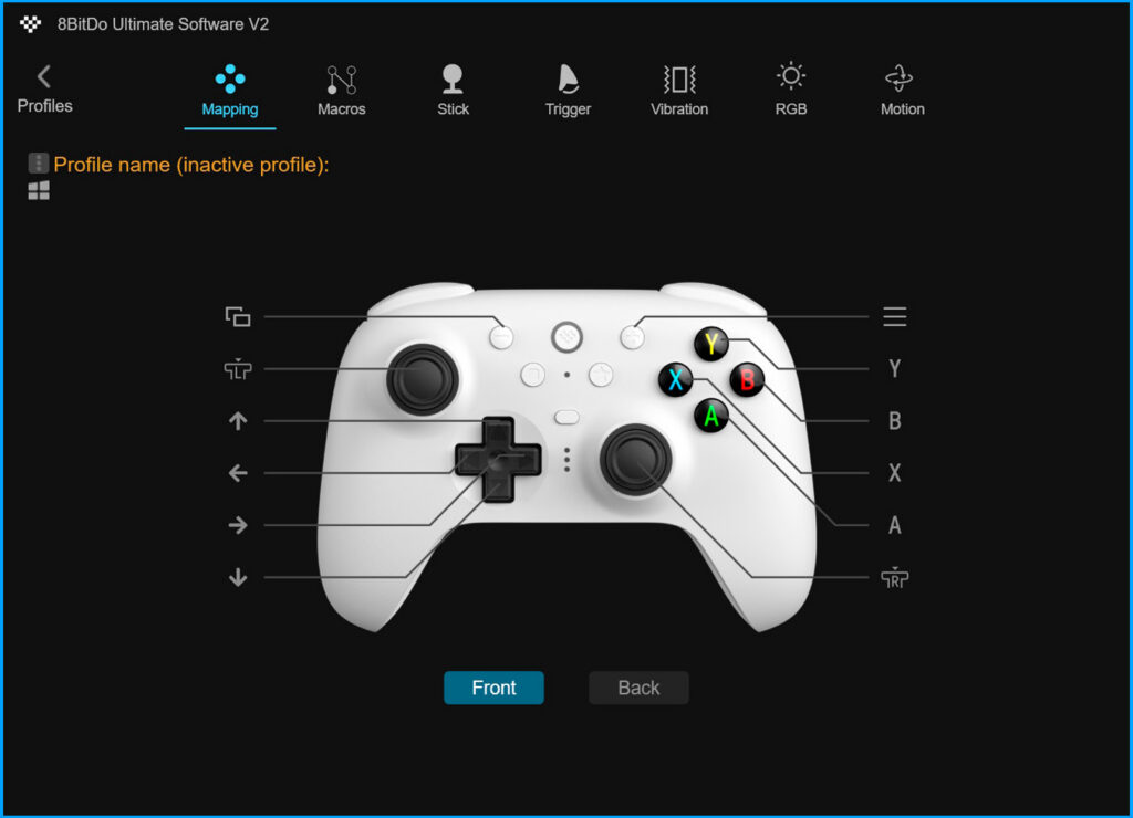 O controle também conta com um software que eu achei muito intuitivo de entender. Também sendo possível configurar muitas coisas como: Mapeamento das teclas, Macro, Joystick (ponto morto), gatilhos, vibração, RGB e Giroscópio.